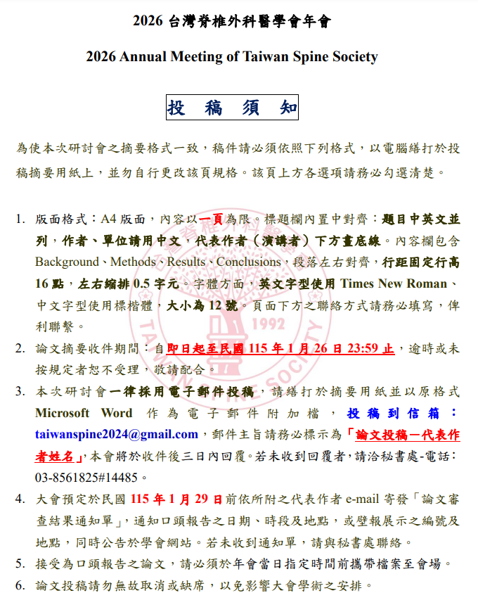 ●「2026台灣脊椎外科醫學會年會公告-投稿須知及優秀論文比賽辦法公告」
