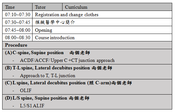 下午開始,原本Table 1,5學員改到Table3,7做頸椎前開及L5/S1 ALIF,依此類推(學員跟著大體老師移動,從table 1換到table 3; table 5換到table 7……)
