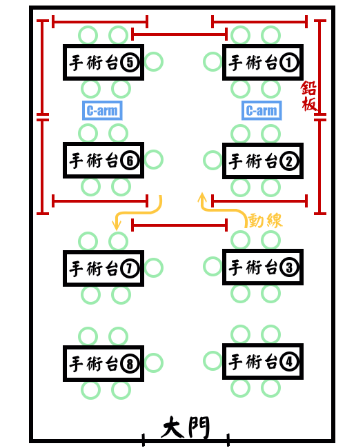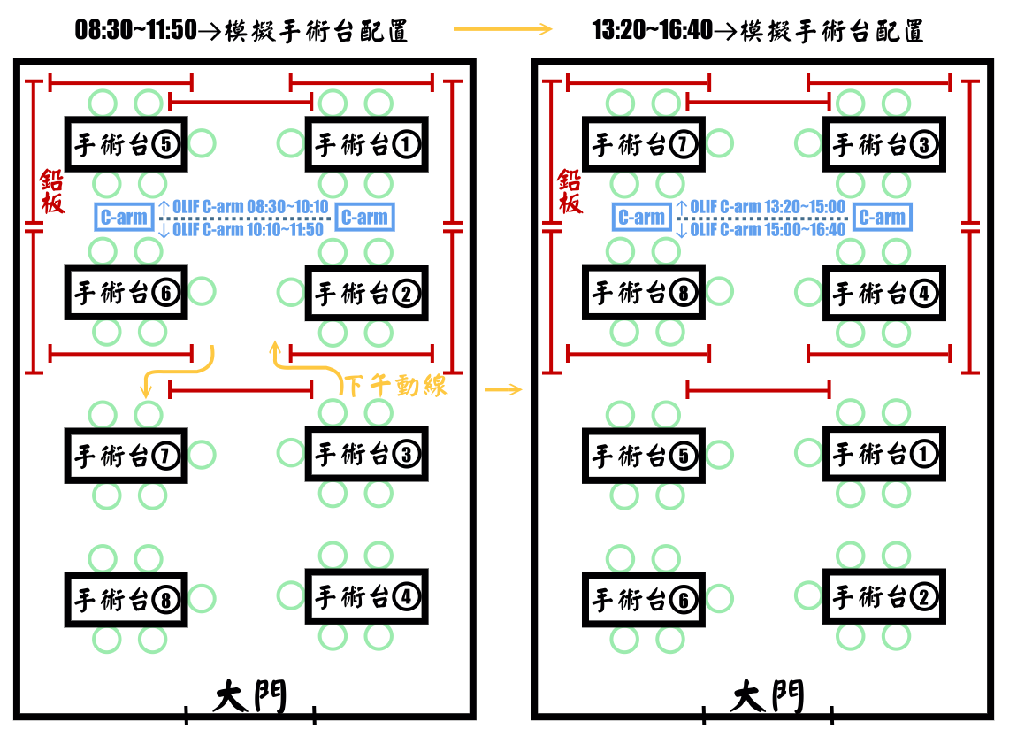 因為去年模擬手術主要做脊椎後開,今年改以脊椎前開為主,此次術式中(B).(C)需要C-arm輔助,為節省學會成本(因為模擬醫學中心鉛板(僅能隔4張床)、C-arm(2台)數量有限,如需增加要額外向廠商租借,價格費用不菲),因此今年場地佈置如下圖: