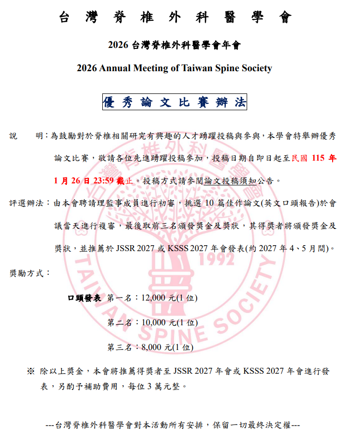 ●「2026台灣脊椎外科醫學會年會公告-投稿須知及優秀論文比賽辦法公告」