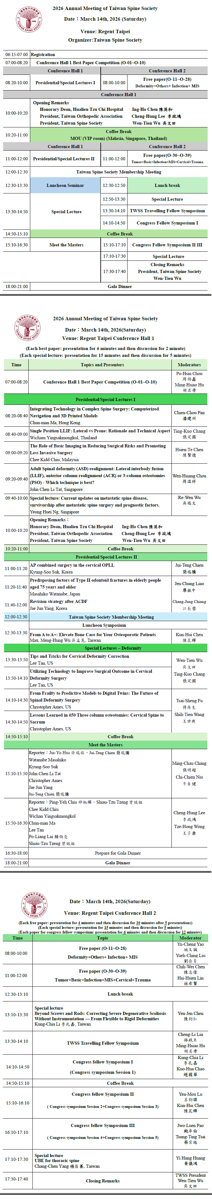 六國脊椎外科學會理事長 Presidential Lectures。(日本、韓國、新加坡、馬來西亞、泰國、香港) |